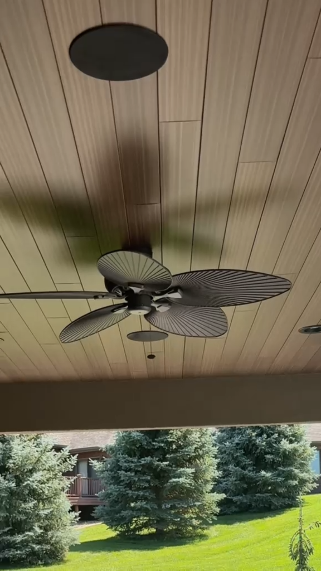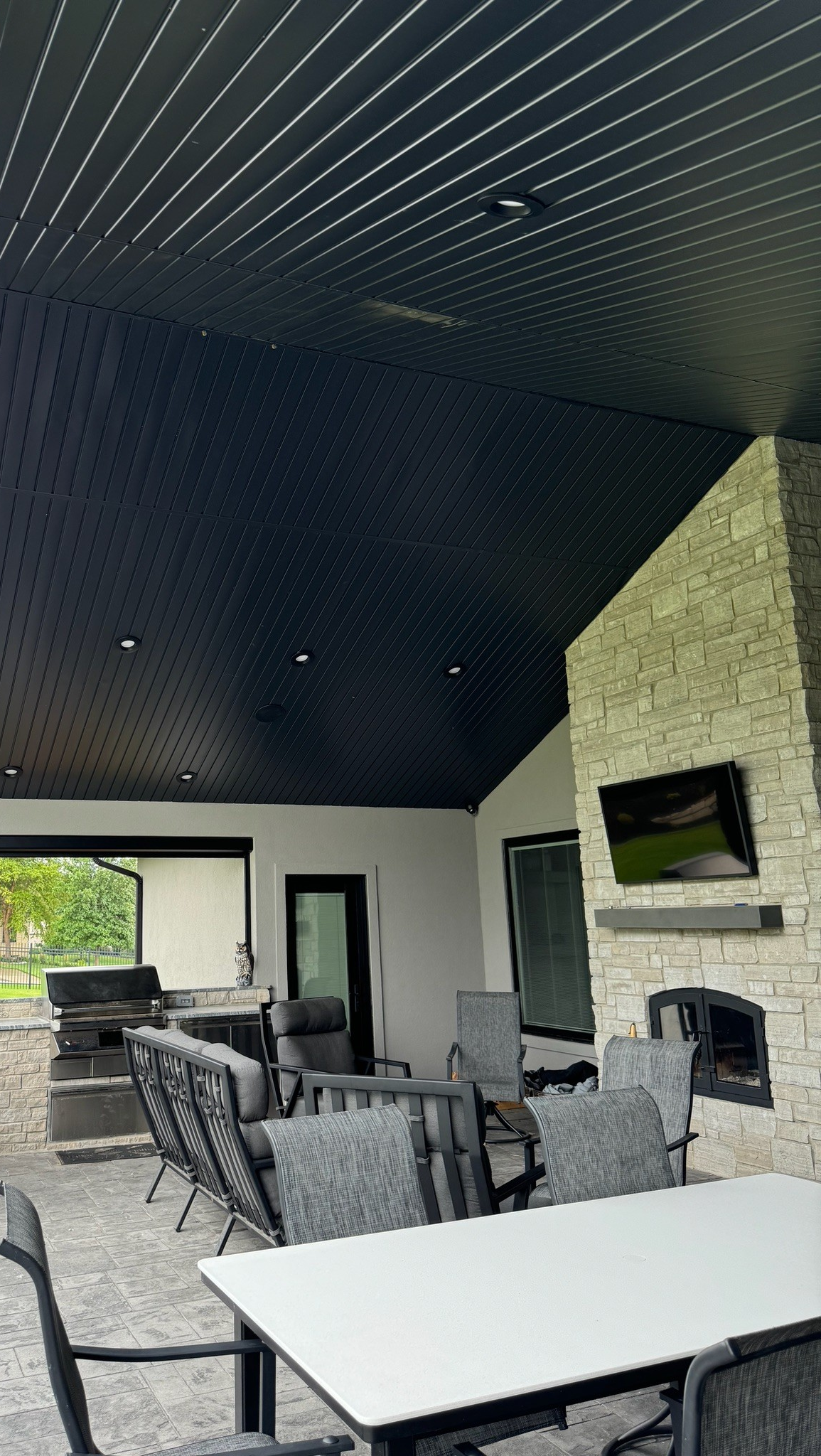 Custom entertainment system with in ceiling speakers and outdoor tv allows this system to survive most weather conditions.